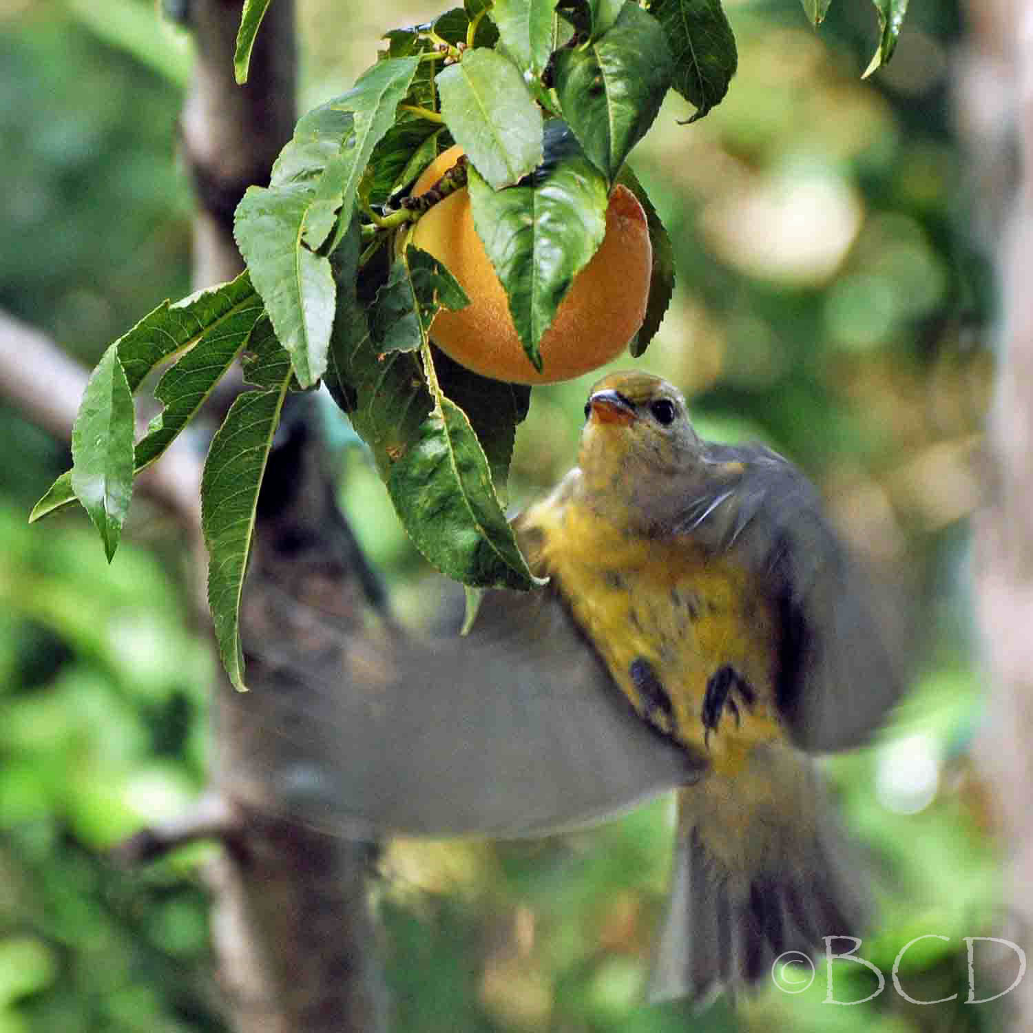 Yellow bird nibbling on peach